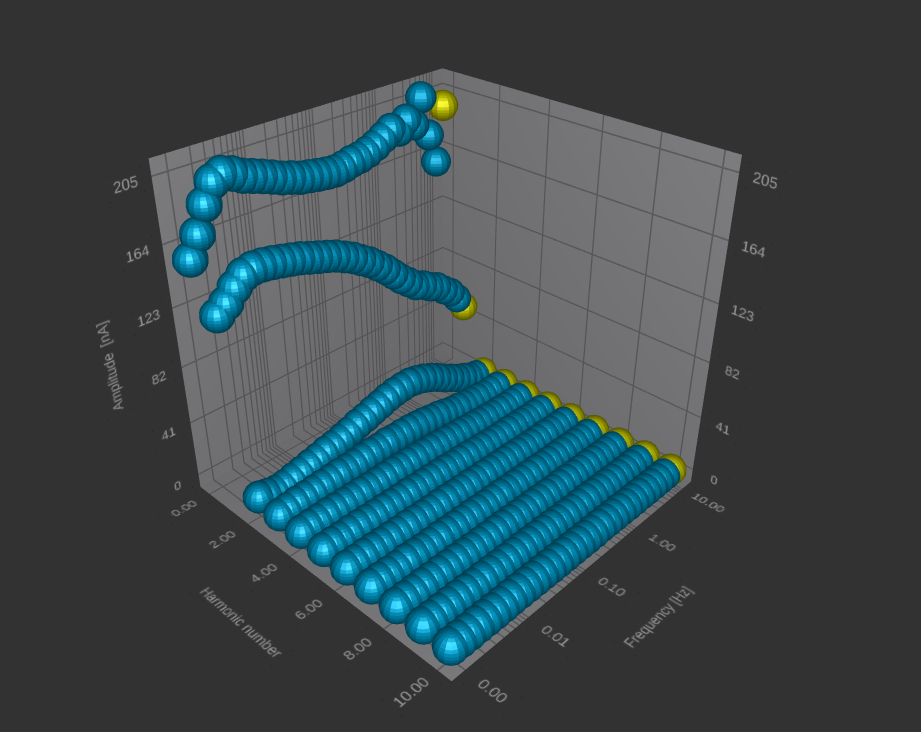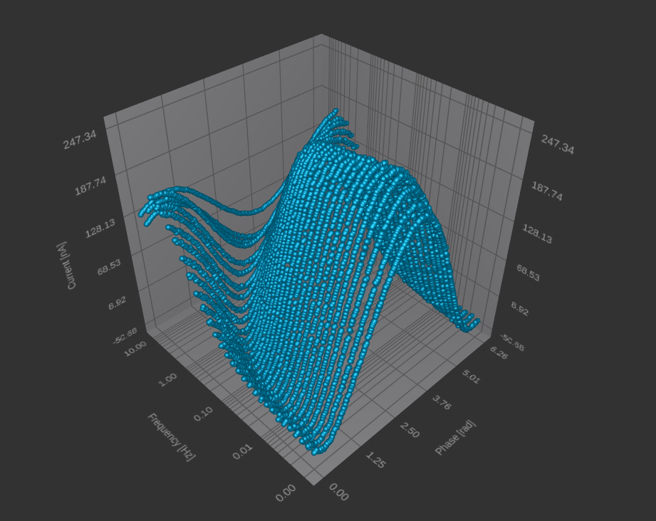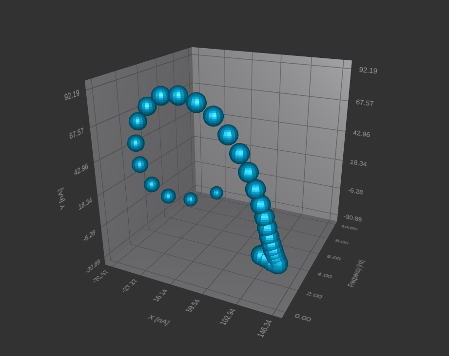 光変調周波数の関数として光電流の実数部と虚数部を示す 3D ナイキスト (アルガン) プロット。