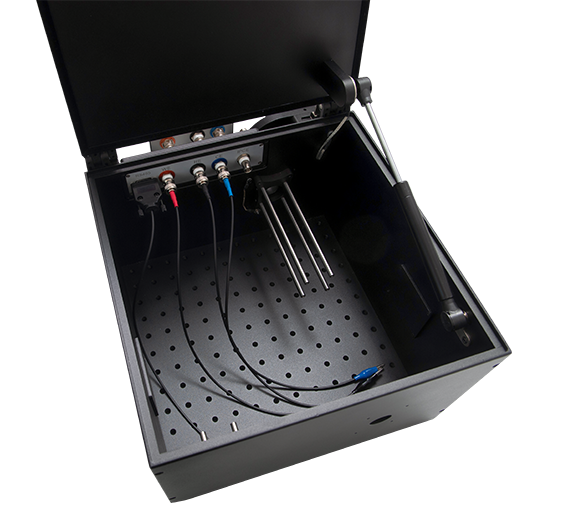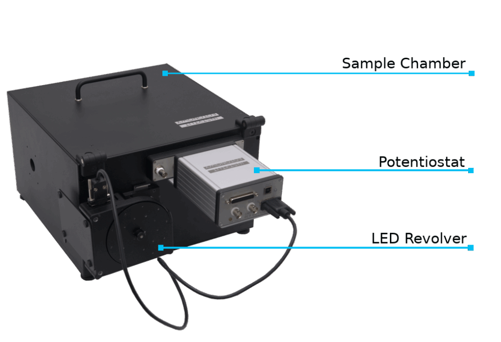 強度変調光電流・光電圧分光システムは、静的光電圧/光電流測定を補完するサンプル検査を可能にします。幅広い周波数範囲で正弦波状の光強度を変調した単色LEDを使用することで、拡散パラメータ、サンプルの時間スケール(キャリア輸送時間)、再結合速度など、多くの運動学的特性を調査できます。電解液に浸漬された光電気化学サンプルの場合、サンプルの両側から光を照射することができます。電解液を通して電解液とサンプル表面の界面を検査するか、背面の光学窓を通して基板とサンプルの界面を検査します。サンプルセットアップは、周囲光と外部電磁場を遮蔽するサンプルチャンバー内に設置されます。