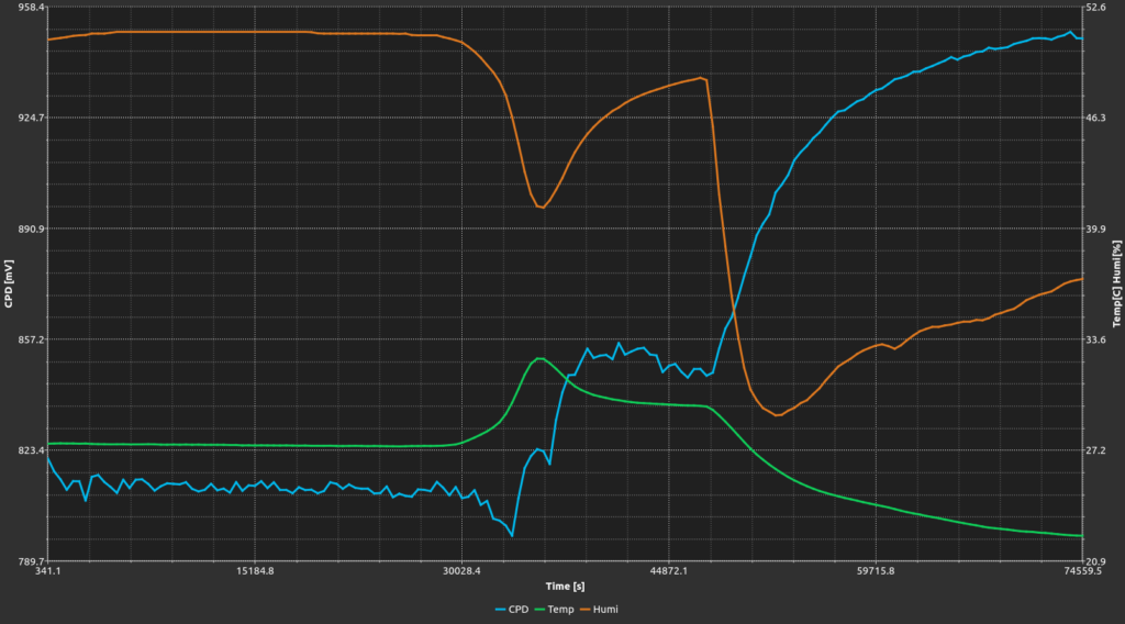 サンプルチップ接触電位差(青)と記録された周囲空気温度(緑)および相対湿度(オレンジ)