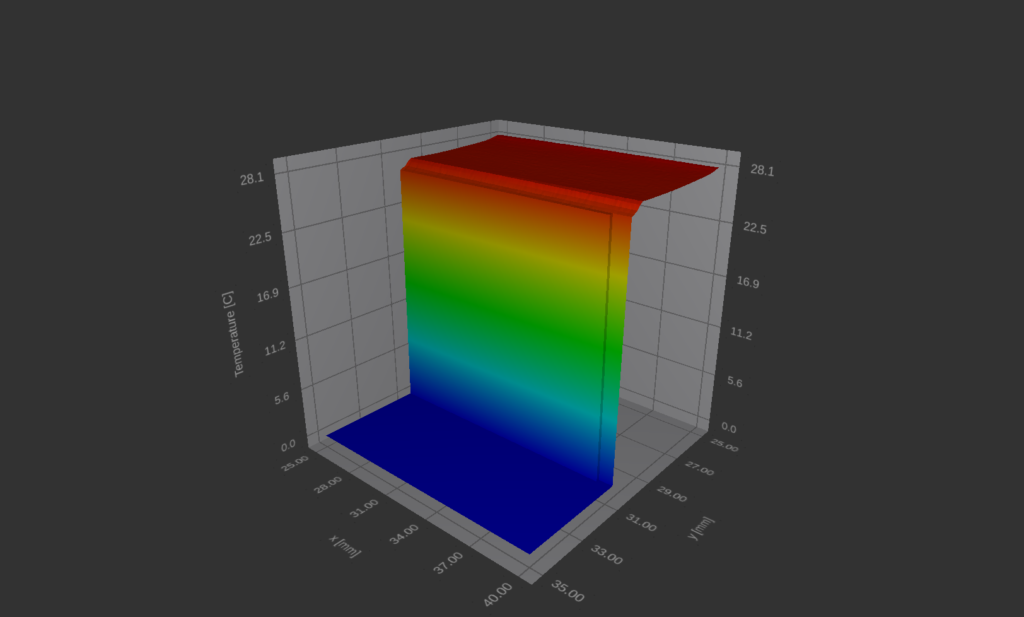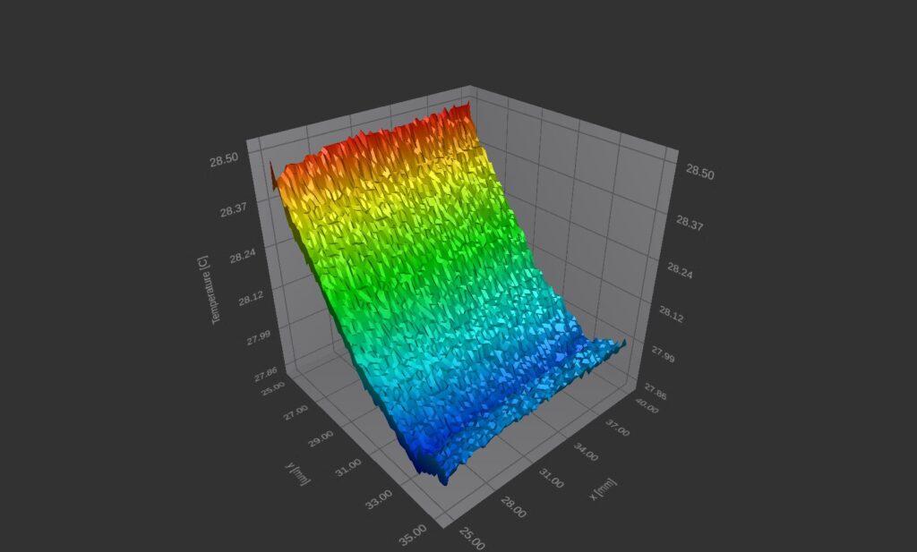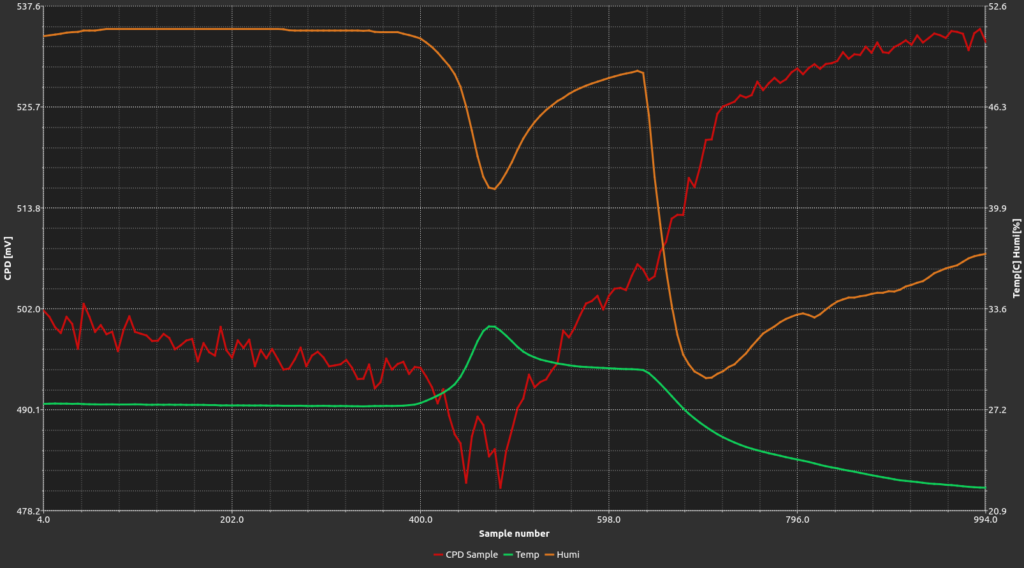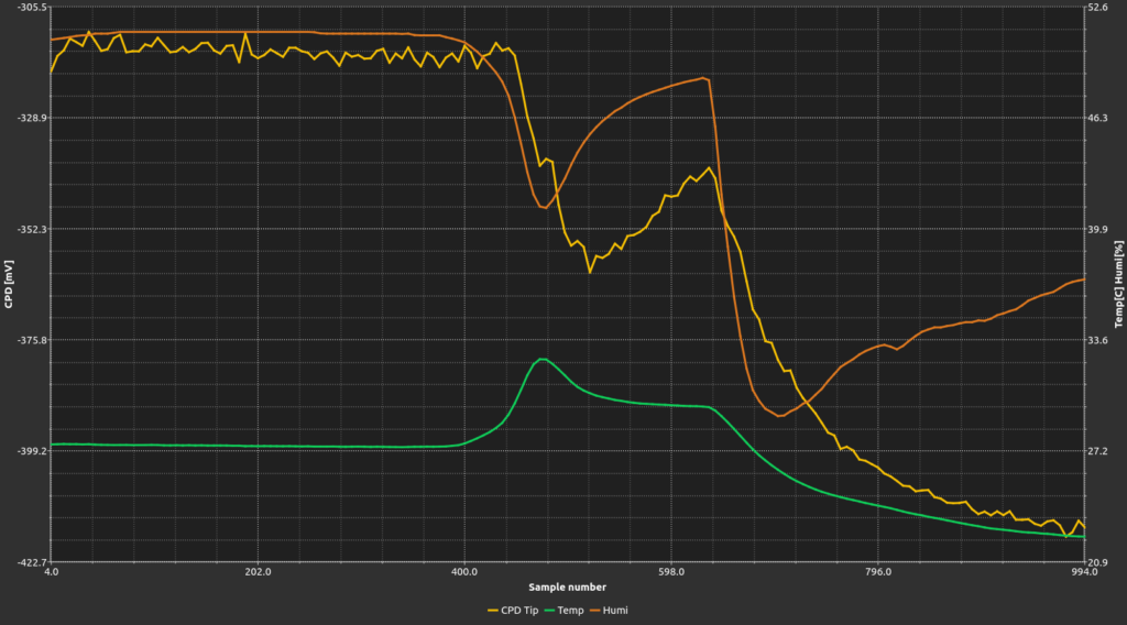 サンプルと接地面の接触電位差(赤)と、記録された周囲温度(緑)および相対湿度(オレンジ)。これはサンプル先端の変化のごく一部を表しています。