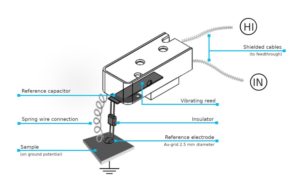 ケルビンプローブ装置の最も重要な部分はプローブチップです。参照電極は直径2.5mmの金メッシュでできており、サンプルから0.5mm離れた位置からでも高いS/N比を実現します。そのため、検査対象となるサンプル表面が粗面であっても研磨面であっても問題ありません。チップの振動は電磁石によって生成されます。