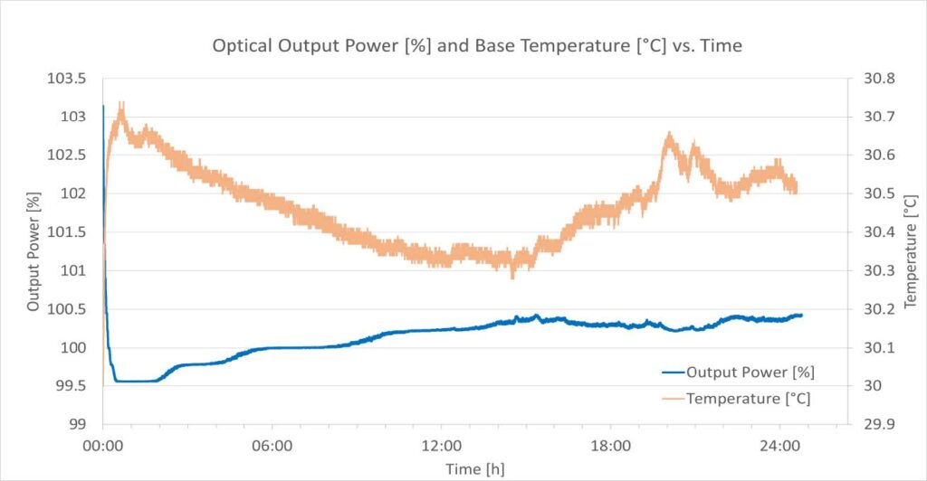 内部温度安定後、光出力のドリフトは24時間で1%以下となります。内部の温度は光源に内蔵した温度センサーによってモニタリングされます。