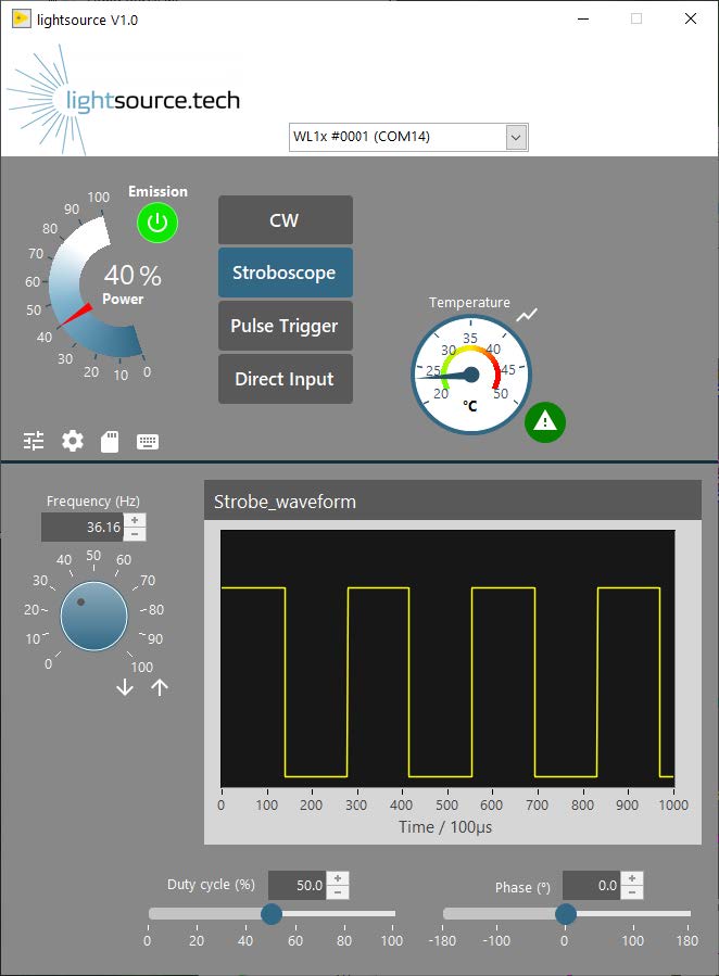 明るさと(動作モードに応じて)その他のパラメータは、ロータリーノブで簡単に制御できます。光源は、シリアルRS232インターフェース(USB経由)経由でも完全に制御できます。これは、あらゆるプログラミング環境から簡単なコマンドを直接入力するか、付属の便利なGUIを使用して行うことができます。