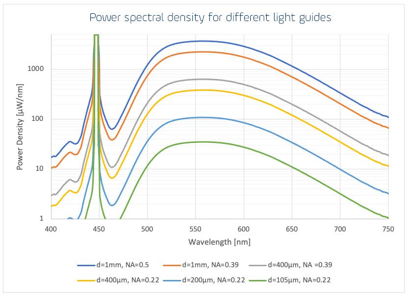 蛍光体による光変換によって生成される白色光は、測定可能な偏光性もコヒーレンス性も示しません。しかしながら、450nm付近のスペクトルの青色部分は、励起レーザーからの散乱光から得られます。この部分では、残留コヒーレンスが観察される可能性があります(例えば、光ファイバーを通過した後でもレーザースペックルが見られるなど)。残留偏光は、スペクトル全体に対して1%未満です。460nmのロングパスフィルタを使用することで、偏光とスペックルを完全に除去できますが、出力は50%減少します。