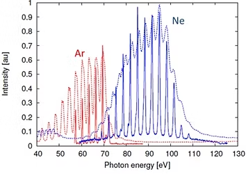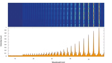 maxLIGHTの分解能を示す測定結果。示されている高調波スペクトルは、単一のフェムト秒レーザーパルスと固体ターゲットとの相互作用と、それに続くスペクトルフィルタリングによって生成されます。生成プロセスに固有のサブストラクチャは、XUV分光計によって明瞭に分離されています。