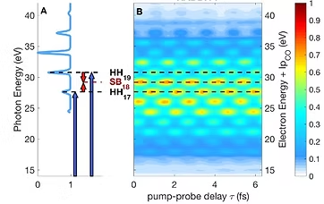 高次高調波は単一光子遷移(青矢印)に起因し、一方、XUVおよび赤外光による二光子遷移は光電子スペクトルにサイドバンドをもたらす(右パネル)。