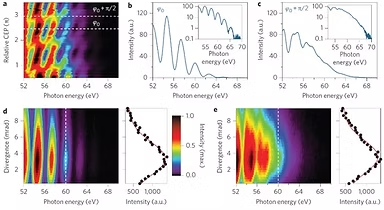 maxLIGHT XUVで測定した、150kHz繰り返し周波数におけるカットオフ領域における高強度高調波スペクトル。CEPの変化は、いくつかのCEP設定において変調の消失を示しており、孤立したアト秒パルスを示唆している。