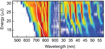 maxLIGHT XUVで測定した高強度高調波スペクトル(右パネル)と、カゴメPCFで拡がった基本波25fsパルスのスペクトル(左パネル)。ポンプエネルギーの増加に伴い、ソリトン自己周波数の青方偏移が高強度高調波に及ぼす影響が明確に観察される。