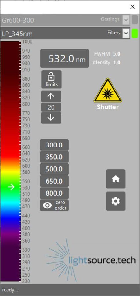 Monochromator-HはWindows10, 64bitで使用可能なソフトウエアパッケージが含まれます。パッケージには波長校正データが含まれ、GUI経由で出力波長を設定することができます。また適切な2次光カットフィルターが自動で切り替わります。