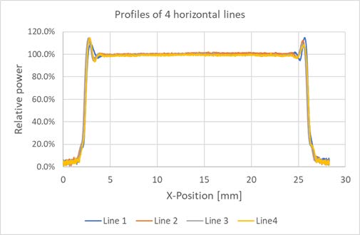 照明視野のエッジには、フライアイコンデンサー設計により典型的な輝線が見られます。エッジ意外は照明視野全体にわたって非常に平坦で均一な光分布を示しています。照射野のサイズは20×20 mm²です。光強度の変動は+/- 2%以内です。
