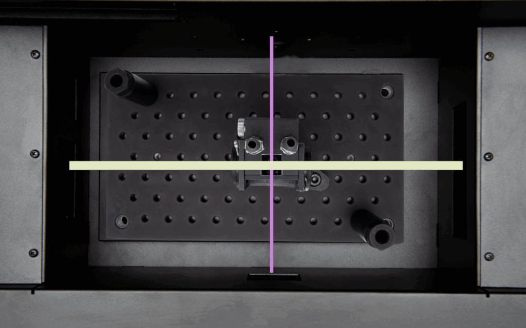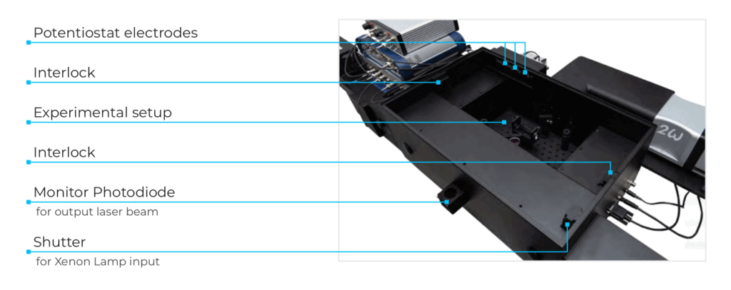 サンプルチャンバーは、測定装置を背景拡散光および外部電磁場から遮断します。チャンバーを開けるとキセノンランプとレーザー光源の電源を切断する安全システムと、複数の異なる実験装置を容易かつ安定的に設置できるシステムを備えています。